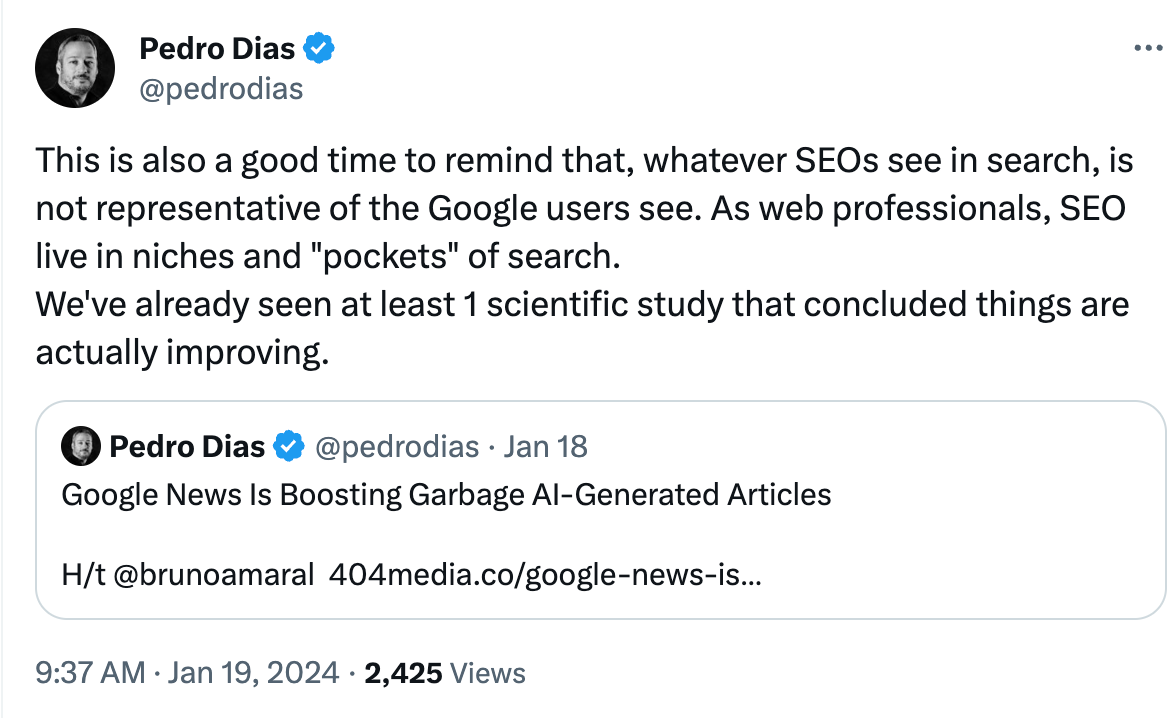 Pedro posted on X and there were some good points picked up by his network. Some people mentioned the slow moderation of quality content, and others highlighted that Google may have underestimated the impact of AI-generated content.